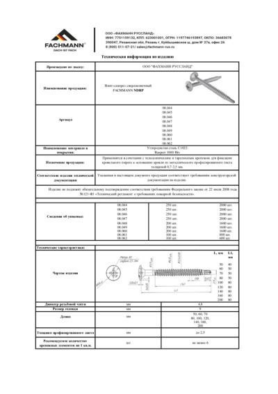 Паспорт Винт-саморез FACHMANN сверлоконечный NDRP-4,8