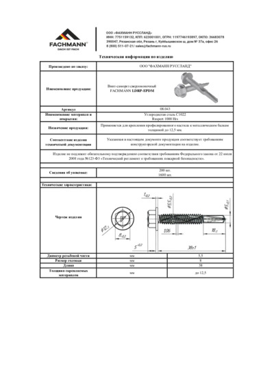Паспорт Винт-саморез FACHMANN сверлоконечный с шайбой LDRP-EPDM-5,5