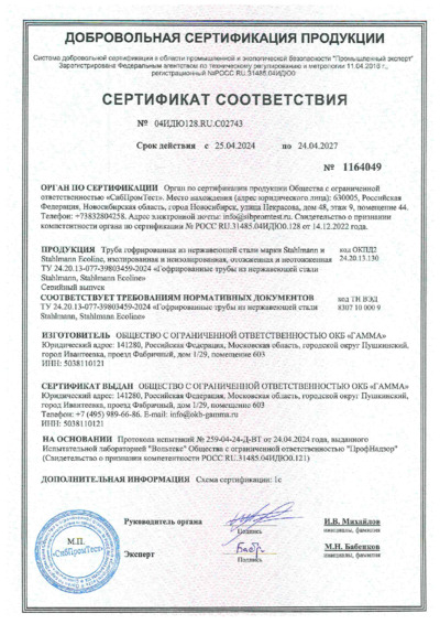 Добровольный сертификат гофририрированные трубы Stahlmann