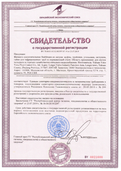Свидетельство о государственной регистрации о соответствии единым санитарно-гигиеническим и эпидемиологическим требованиям на фитинги Stahlmann