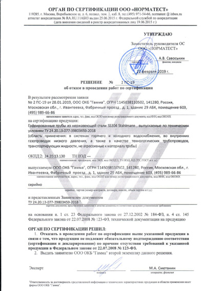 Решение (отказное письмо) на гофротрубу Stahlmann SS304 № 2 ПС 19