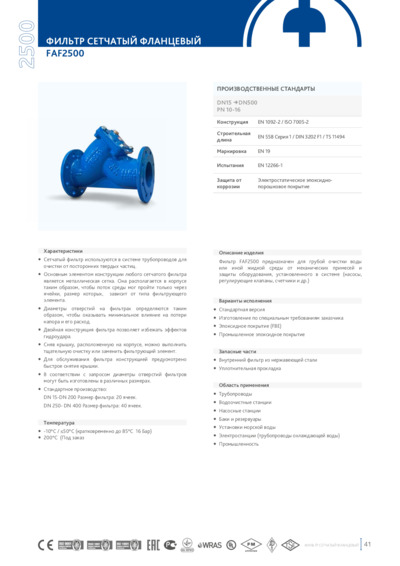 Технический лист. Фильтр сетчатый чугунный FAF 2500 со сливной пробкой