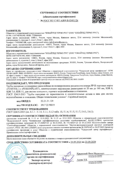 Сертификат соответствия полипропиленовые трубы Fusitek однослойные