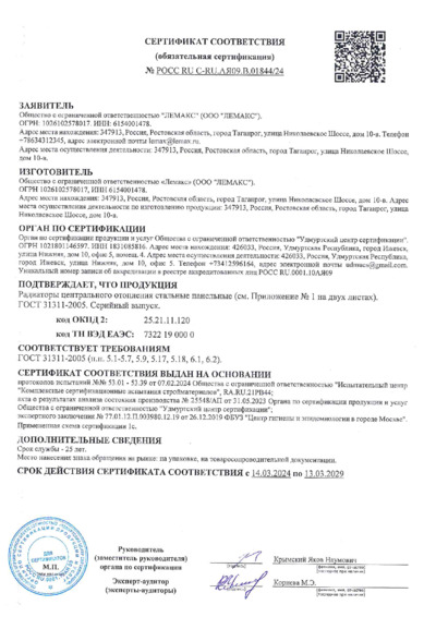 Сертификат соответствия стальные радиаторы PRIMOCLIMA
