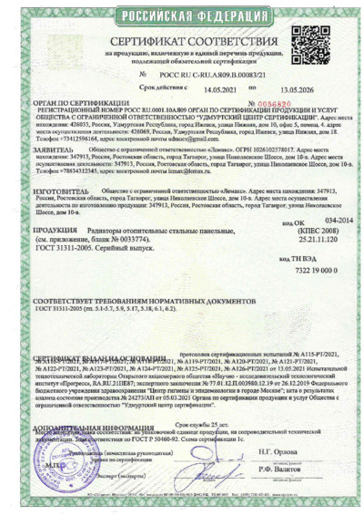 Сертификат соответствия ГОСТ 31311-2005 панельные радиаторы PRIMOCLIMA