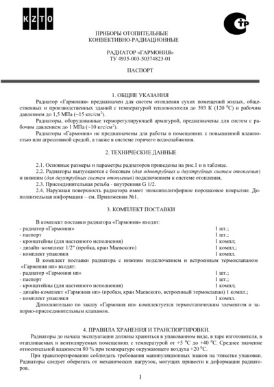Паспорт радиатор KZTO Гармония