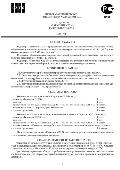 Паспорт радиатора Гармония С25 N