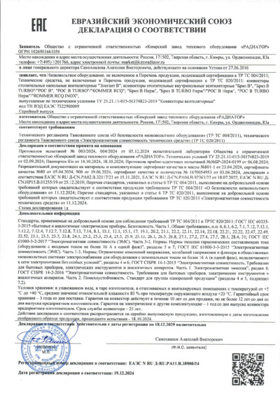 Декларация соответствия Бриз В, Элегант В