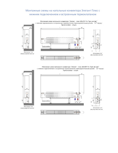 Монтажные схемы на напольные конвектора Элегант Плюс с нижним подключением и встроенным термоклапаном