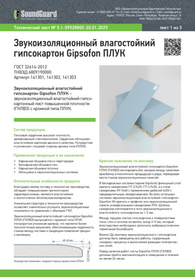 Технический лист Звукоизоляционный влагостойкий гипсокартон Gipsofon ПЛУК
