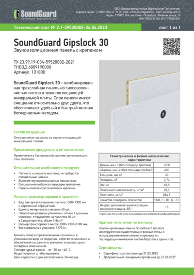 Технический лист SoundGuard Gipslock 30