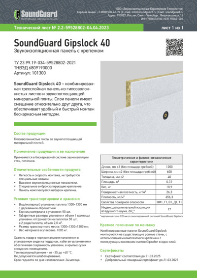 Технический лист SoundGuard Gipslock 40