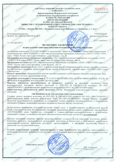 Экспертное заключение Панель звукоизоляционная SoundGuard ЭкоАкустик