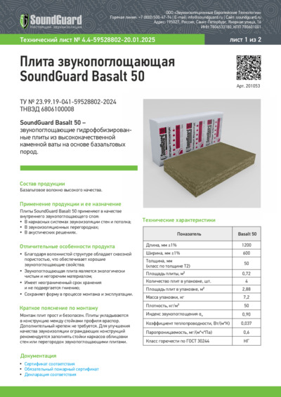 Технический лист Плита звукопоглощающая SoundGuard Basalt 50