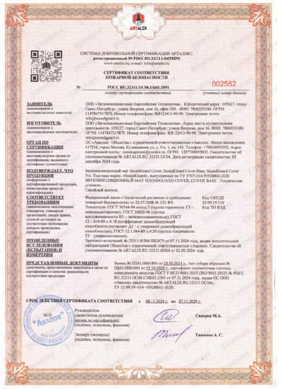 Сертификат пожарной безопасности SoundGuard Cover