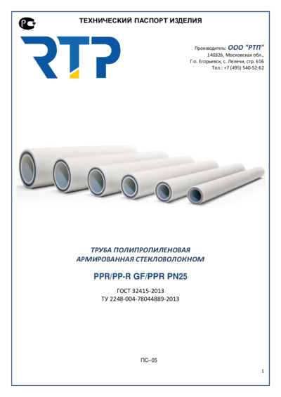 Паспорт. Труба РТП полипропиленовая армированная стекловолокном PN25