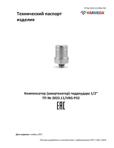 Технический паспорт. Компенсатор (амортизатор) гидроудара Varmega