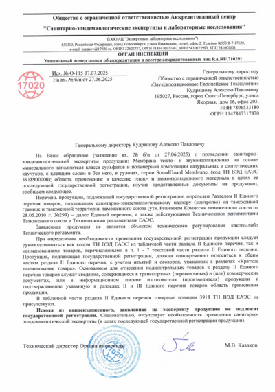 Санитарно-эпидемиологическая экспертиза мембраны SoundGuard