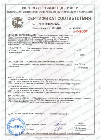 Сертификат. Демпферная виброгасящая лента SoundGuard ВиброЛента