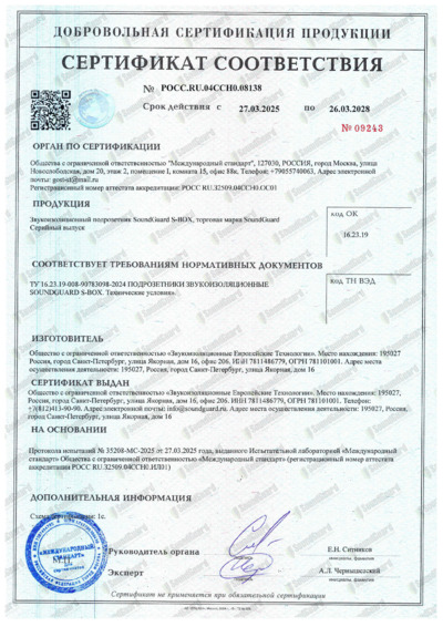 Сертификат соответствия подрозетники SoundGuard S-BOX