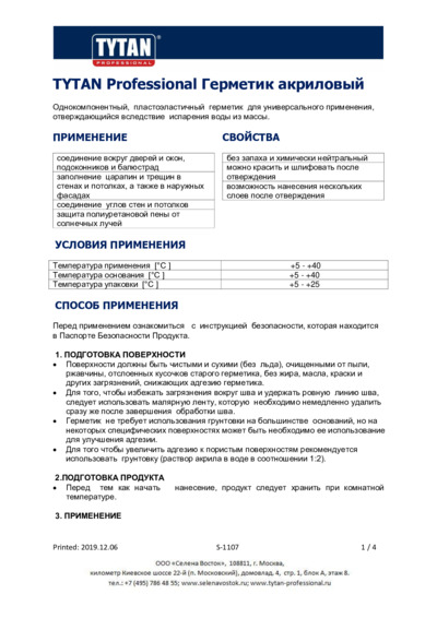 Технический лист. Герметик акриловый Tytan Professional