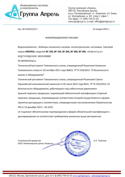 Отказное письмо. Бойлер косвенного нагрева ARDERIA BF
