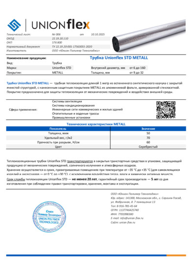 Технический лист. Трубка Unionflex STD METALL