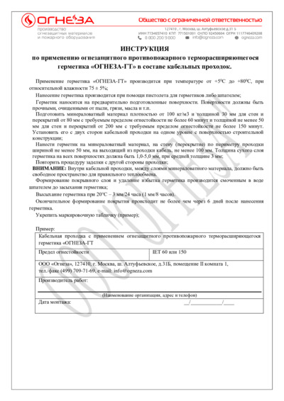 Инструкция по применению ОГНЕЗА-ГТ в составе кабельных проходок