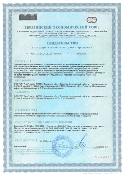 Сертификат госрегистрации Трубы SLT AQUA PP-R-GF
