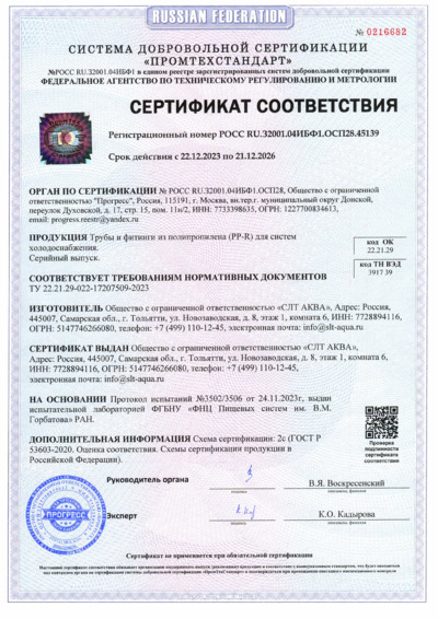 Сертификат соответствия SLT AQUA трубы и фитинги PP-R для систем холодоснабжения