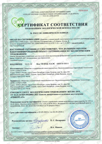 Сертификат ЭКО SoundGuard FIBROPLAN