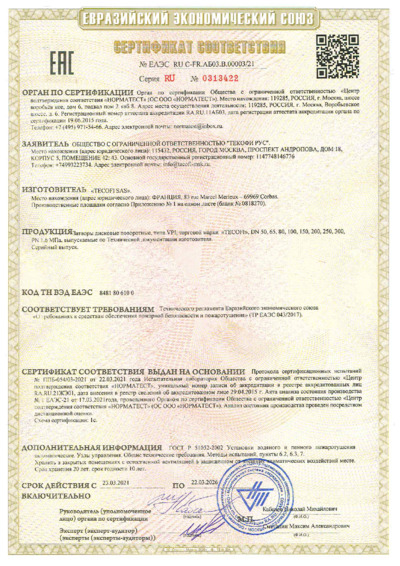Сертификат соответствия Tecofi затворы дисковые поворотные VPI