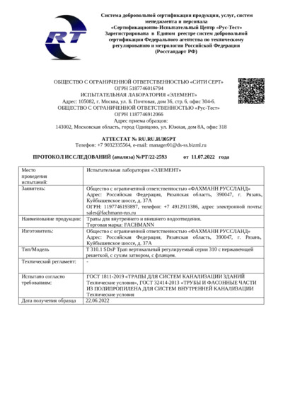 Протокол испытаний на трапы FACHMANN для водоотведения