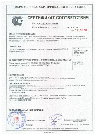 Сертификат соответствия USYSTEMS трубы PE-Xa в теплоизоляции