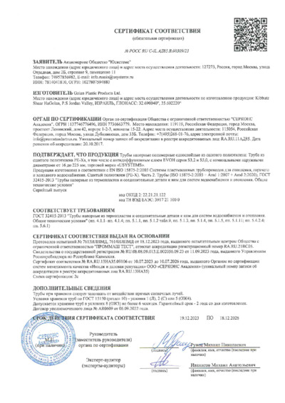Сертификат соответствия ГОСТ. Пластиковая труба USYSTEMS Water pipe PE-Xa 40-125 мм