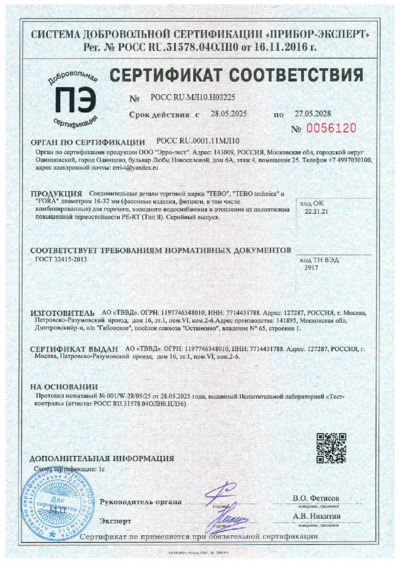 Сертификат соответствия соединительные детали TEBO, TEBO technics, FORA