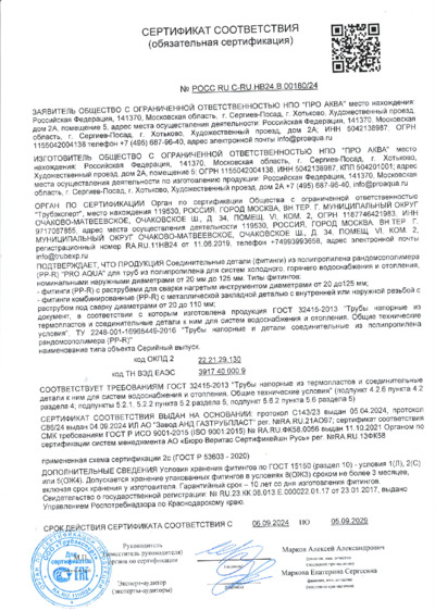 Сертификат соответствия ГОСТ 32415-2013 Трубы напорные из термопластов и соединительные детали к ним ПРО АКВА.