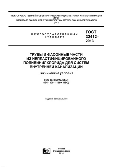 ГОСТ 32412-2013 Трубы и фасонные части из непластифицированного поливинилхлорида для систем внутренней канализации