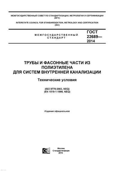 ГОСТ 22689-2014 Трубы и фасонные части из полиэтилена для систем внутренней канализации