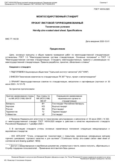 ГОСТ 14918-2020 ПРОКАТ ЛИСТОВОЙ ГОРЯЧЕОЦИНКОВАННЫЙ