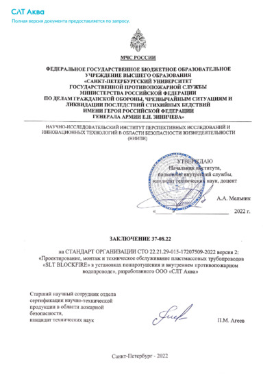Заключение от 2022 на СТО № 37-08.22 / НИИПИиИТвОБЖ СпБУ ГПС МЧС России