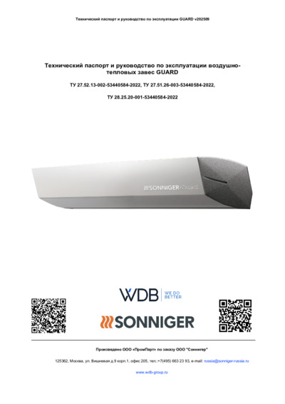 Технический паспорт. Sonniger Тепловые завесы GUARD