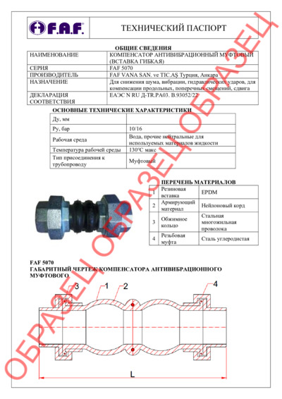 Технический паспорт. Компенсатор резиновый резьбовой FAF 5070