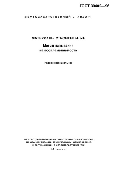 ГОСТ 30402-96 Материалы строительные. Метод испытания на воспламеняемость