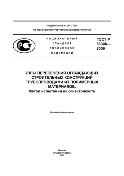 ГОСТ Р 53306-2009 Узлы пересечения ограждающих строительных конструкций трубопроводами из полимерных материалов. Метод испытаний на огнестойкость