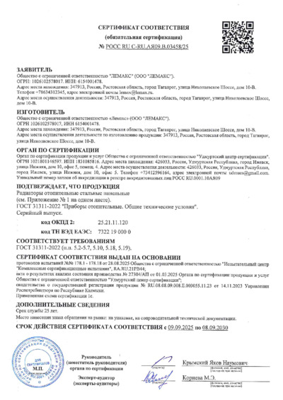 Сертификат соответствия радиаторы стальные панельные LEMAX до 08.09.2030