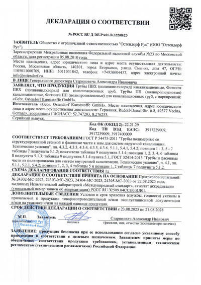 Декларация о соответствии трубы и фасонные части Ostendorf из ПВХ, ПП до 21.08.2028