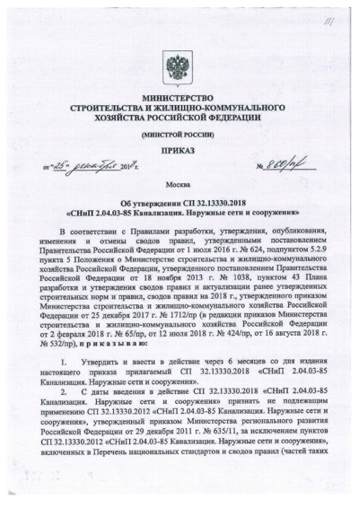 СП 32.13330.2018 является актуализированной редакцией СНиП 2.04.03-85 и представляет собой основной нормативный документ в сфере проектирования систем водоотведения населённых пунктов. Свод правил распространяется на вновь строящиеся и реконструируемые наружные сети канализации, а также на все виды сооружений постоянного назначения, предназначенных для отведения и очистки бытовых, поверхностных (дождевых и талых) и близких к ним по составу производственных сточных вод, за исключением объектов, расположенных в зонах вечной мерзлоты.