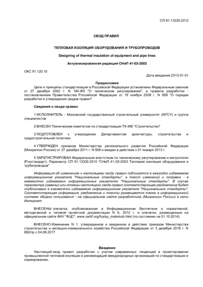СП 61.13330.2012 является актуализированной редакцией СНиП 41-03-2003 и представляет собой свод правил, обязательный для соблюдения при проектировании тепловой изоляции широкого спектра промышленных объектов. Этот документ распространяется на наружную поверхность оборудования, трубопроводов, газоходов и воздуховодов, расположенных как внутри зданий и сооружений, так и на открытом воздухе, с температурой транспортируемых веществ от минус 180 до 600 градусов Цельсия, включая трубопроводы тепловых сетей при всех способах прокладки, а также применяется при реконструкции тепловых электростанций.