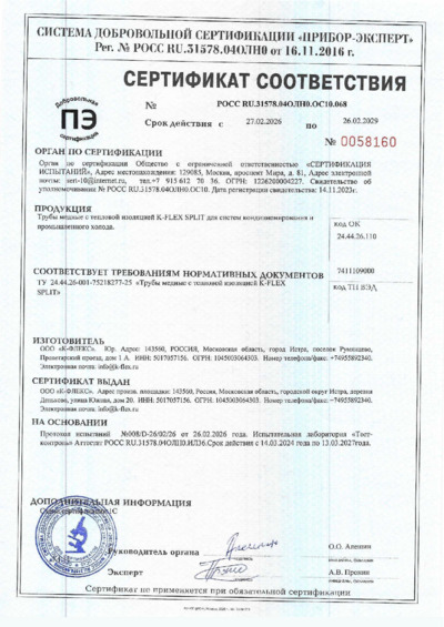 Сертификат соответствия Медная труба с тепловой изоляцией K-FLEX SPLIT до 26.02.2029